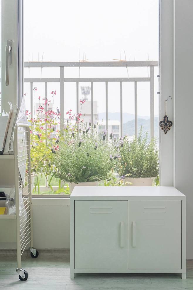 책상 끝, 북카트 너머에는 작은 화단이 있답니다. 에어컨 실외기가 있는 부분은 커튼으로 가려두고 나머지 여유 공간에 화분을 두었어요. 왼쪽부터 차례로 체리 세이지, 라벤더, 매발톱, 로즈마리입니다. 크게 손 갈 일 없이 잘 자라주는 고마운 허브 친구들이에요.