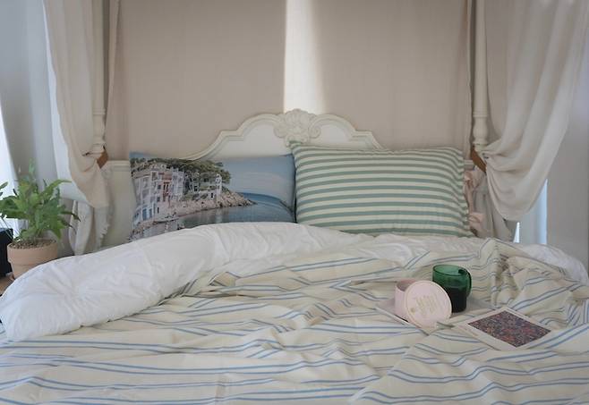 침구는 며칠 전 여름 느낌으로 새 단장했어요. 테마는 '휴양지'! 일하기 싫은 마음을 담뿍 담아 꾸몄습니다. 아직 유럽은 가보지 못했는데, 기회가 된다면 남부 프랑스와 이탈리아, 포르투갈은 꼭 가보고 싶어요. 멋진 휴양지 사진이 프린트된 커버를 발견해 메인으로 두고, 직접 만든 스트라이프 패턴의 커버와 홑이불을 매치했어요.