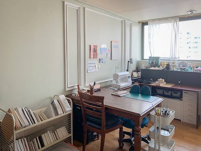 원래 쓰던 작은 방의 작업실입니다. 작은 방이 커다란 가구들로 가득 채워져 있었어요. 처음 작업 공간을 만들 때는 신나서 직접 웨인스코팅 작업도 하고, 페인트칠도 해서 뿌듯하기만 했는데, 지금 보니 정신없네요. 사용하다 보니 제 짐을 전부 담기에 공간이 작고, 에어컨이나 조명도 아쉬워서 큰 방으로 옮기게 되었어요.