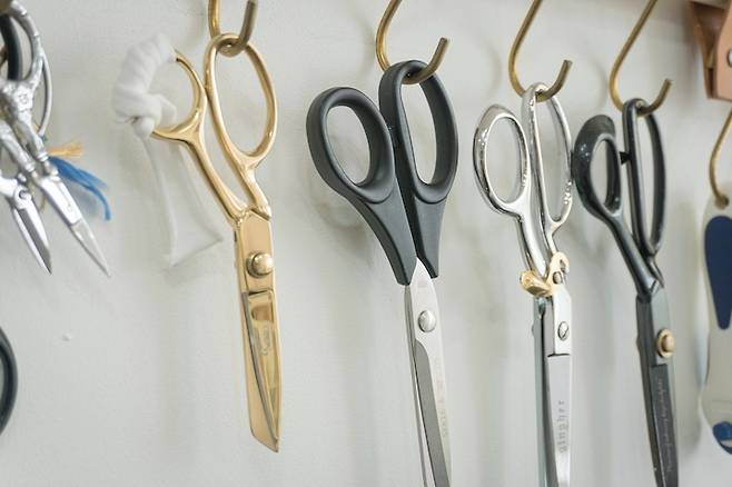 행잉 레더 스트랩에 매달아 사용하고 있는 가위들. 캠핑에서 컵이며 주전자를 걸어둔 걸 보고 가위도 이렇게 걸어두면 멋지겠다 싶어서 찾은 방법이에요. 놀러 오는 사람들마다 신기하다고 얘기하는 작업실의 볼거리입니다.