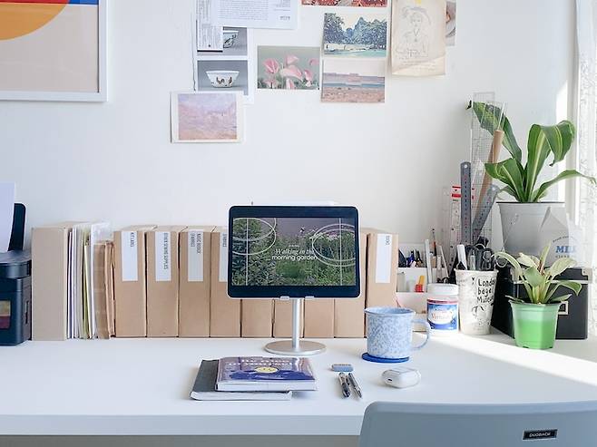 책상만큼은 깨끗하게 유지하려고 하지만 이것저것 늘어놓기 좋아하는 성격이라서요. 정신 차리고 보면 한가득인 책상이에요. 저는 스스로에게 관대한 사람이라 자주 쓰는 물건까지는 책상 위에 놓아도 봐주기로 했어요.