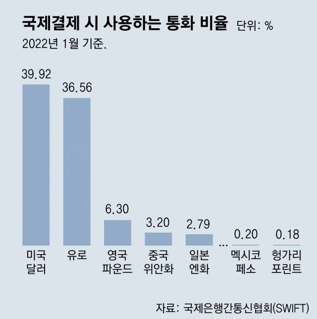 객관적으로 보면 우리나라가 곧 기축통화국이 될 것 같진 않다. 국제은행간통신협회(SWIFT)에 따르면 국제결제 시 사용하는 통화 비율이 미국 달러화(39.92%) 1위, 유로(36.56%)가 2위다. 영국의 파운드(6.3%) 3위이고 원화(0.2%)는 20위에도 들지 못했다.