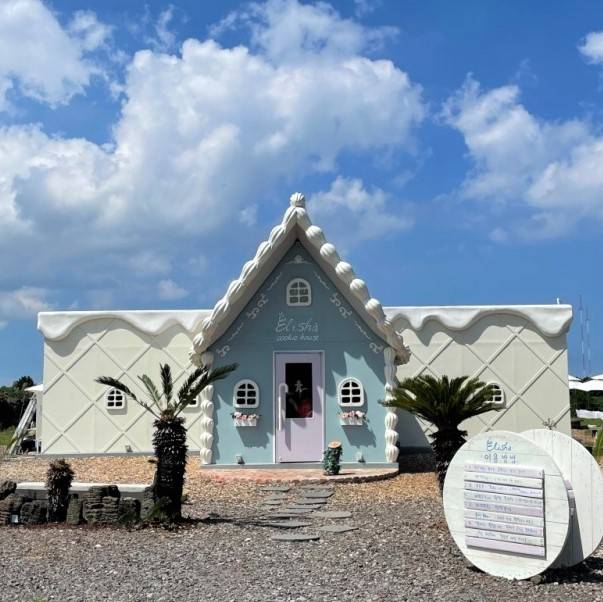 동화 속 과자집의 실사판, 애월의 엘리사 카페다. 뾰족한 생크림 지붕과 밝은 하늘색 벽, 크림이 흘러내리는 듯한 디테일까지 마치 ‘헨젤과 그레텔’ 속의 주인공이 된 느낌이다. 내부로 들어가면 수제쿠키 굽는 냄새에 또 한번 현혹되기 십상이니 배부른 상태에서 방문했다면 꼭 디저트 배를 비워두고 찾아가길 추천하고, 카페 주변을 한 바퀴만 둘러봐도 사진 몇 백장은 건질 수 있으니 배터리 충전도 필수다. 참고로 웨이팅이 긴 편이라 따로 마련된 벤치에서 대기 후 입장할 수 있다.