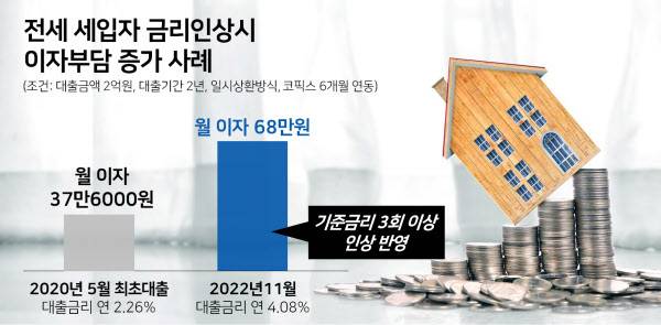 2020년 5월 주택금융공사에서 전세자금대출 2억원을 연 2.26% 금리로 받았던 김모(34)씨. 당시만 해도 한 달 이자는 37만6000원이었다. 2년이 지난 올 5월 대출 연장을 위해 조건을 알아보니 금리가 3.33%를 적용해 월 이자가 55만5000원으로 껑충 뛰었다. 한국은행이 오는 11월까지 기준금리를 세 차례 인상한다면 김모씨가 연말에 적용받는 금리는 적어도 4.1~4.2%까지 오를 전망이다. 매달 이자로 70만원 이상을 내야 한다.
