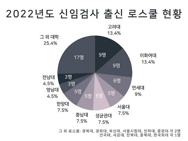 2022년에 임용된 신임 검사를 보면 서울 소재 로스쿨 출신 비중이 늘었다는 특색이 있습니다. 지난해는 서울 소재 11개 로스쿨에서 49명의 검사가 나와 67.1%를 차지했습니다. 2022년에는 서울 소재 12개 로스쿨에서 48명(71.6%)이 나와 배출 검사 수는 줄었지만, 비율은 4.5% 증가했습니다.