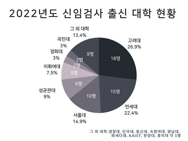 2022년 로스쿨 출신 신임 검사 67명의 중에 가장 많은 학부를 차지하는 학교는 고려대입니다. 고려대 학부 출신은 18명으로 전체의 26.9%입니다. 고려대 출신은 지난해 12명(16.4%)으로 3위에 그쳤지만 올해는 크게 늘어 1위에 올랐습니다. 2위는 지난해 이어 2022년에도 연세대가 차지했습니다. 이번 신임 로스쿨 검사 중 연세대에서 학사학위를 받은 사람은 15명(22.4%)입니다. 지난해 13명(17.8%)보다 2명 늘었습니다.