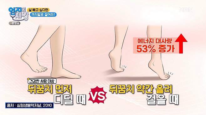 뒤꿈치 먼저 디딜 때와 뒤꿈치는 약간 올려 걸을 때를 비교했을 때,