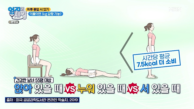 건강한 남녀 55명 대상으로 앉아 있을 때, 누워 있을 때, 그리고 서 있을 때를 비교해 본 결과,