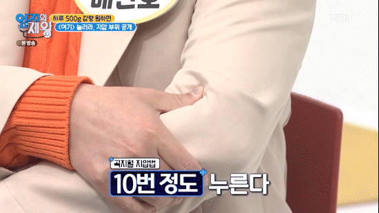 이 곡지혈 부분을 10번 정도 지긋이 눌러주며 지압을 하는 건데요!