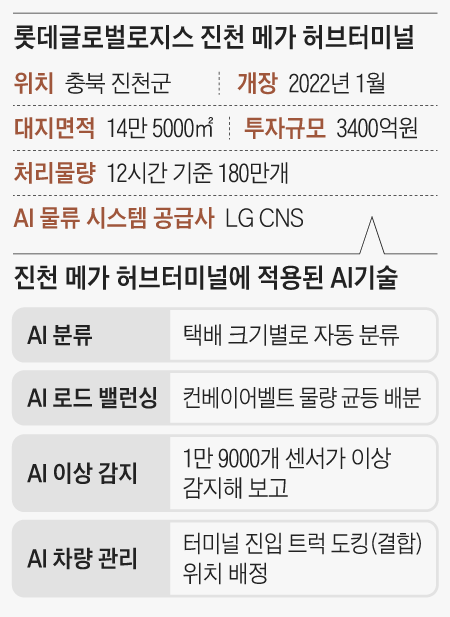 이곳에선 84개 하차대별로 직원 1명씩, 210개 상차대마다 2명씩 배치돼 짐을 내리고 싣는다. 그걸 뺀 나머지 모든 작업, 즉 하차된 택배의 크기와 재질을 스캔해 중대형·소형·이형(異形)으로 분류해 그에 맞는 상차대로 옮기는 작업은 모두 LG CNS의 인공지능(AI) 분류 설비가 담당한다. 이로 인해 14만5000㎡ 크기의 터미널 내부는 윙윙 컨베이어 벨트 돌아가는 소리만 들릴 뿐 직원들은 거의 눈에 띄지 않았다.