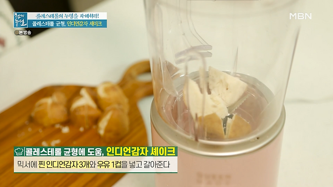 믹서에 찐 인디언 감자 3개와 우유 1컵을 넣고 갈아주면 맛있고 건강한 셰이크 완성!