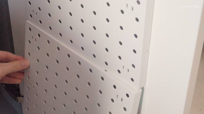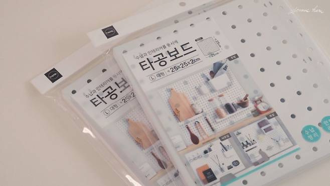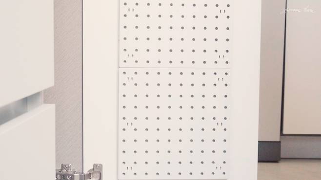 싱크대 수납장 문에 다이소 타공보드를 하나씩 붙여요. 연결 부가 있어서 두개를 겹쳐 붙여도 틈없이 깔끔하게 설치 가능해요.