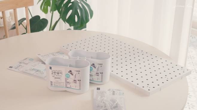 싱크대 문에 설치했더니 요리할 때 꺼내기도 쉽고요 :) 화이트톤의 다이소 타공보드 보기에도 깔끔하답니다.