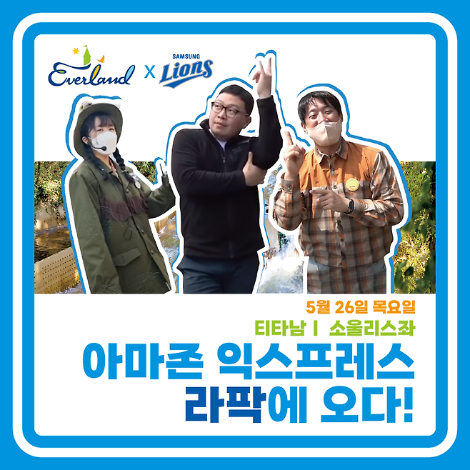 [스포티비뉴스=박성윤 기자] 삼성 라이온즈가 26일 KIA 타이거즈와 대구 홈경기에 에버랜드 데이를 진행한다. 이번 이벤트 데이는 에버랜드 유튜브 채널 티타남(티익스프레스 타주는 남자)이 대구삼성라이온즈파크에 방문하는 컨셉으로 추진하게 되었으며 에버랜드의 어트랙션 아마존 익스프레스 안내 멘트로 인기를 끌다 티타남에 합류한 소울리스좌 (김한나 양)도 참여한다.
