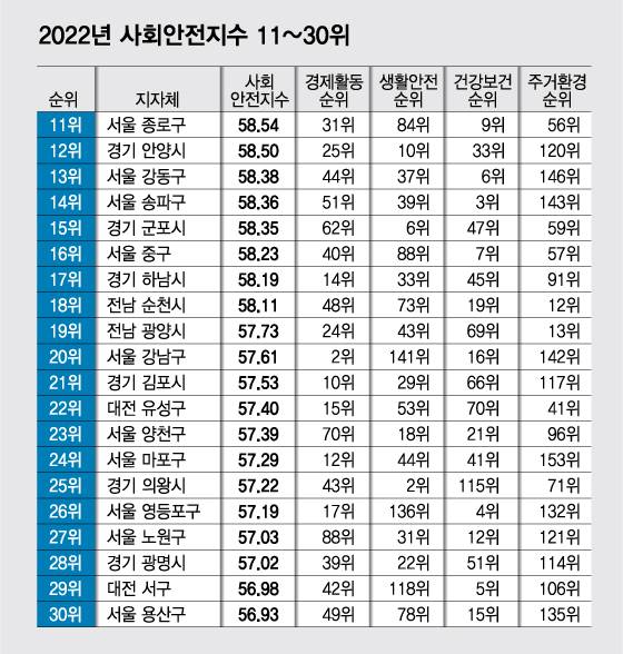 머니투데이는 3일 성신여대 데이터사이언스센터, 케이스탯 공공사회정책연구소, 온라인패널 조사기업 피앰아이와 공동으로 이 같은 내용의 '2022 사회안전지수(Korea Security Index 2022)-살기좋은 지역'을 공개했다. 전국 시·군·구 중 표본 숫자가 적은 지역을 제외한 155곳을 대상으로 경제활동, 생활안전, 건강보건, 주거환경을 종합한 사회안전지수 순위를 매겼다.