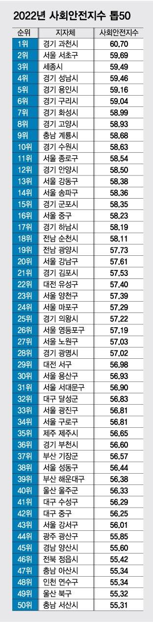 인구, 산업시설 등이 밀집한 수도권은 안정적인 가구소득, 높은 재정 자립도, 인프라 구축, 인구 확보로 이어지는 선순환이 가능하다. 경제력뿐 아니라 안전도 수도권에 집중된다는 의미다. 해당 지방자치단체들은 지역 사회안전을 위한 꾸준한 투자로 주민 만족도를 높였다는 평가다.