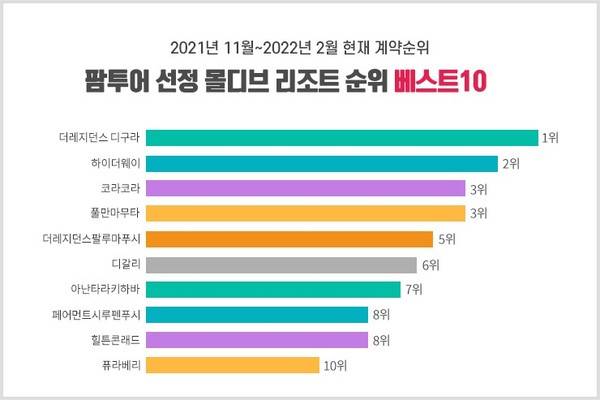 디갈리, 아난타라키하바, 페어먼트시루펜푸시, 힐튼콘래드, 퓨라베리가 선정됐다팜투어 권일호 대표이사는 "팜투어의 주말 신혼여행박람회 방문 고객 대상 통계를 뽑은 몰디브 리조트 베스트 10을 보면 신규오픈 리조트에 대한 관심도가 매우 컸고 또 수중환경, 라군 등 자연환경과 더불어 허니문 후기 및 팜투어만의 단독특전이 선택하는데 큰 영향을 미친 것으로 나타났다"며 "팜투어 박람회 현장에서 몰디브지역에 한해 박람회 미화 최대 즉시할인 600달러는 물론 사전예약 시 추가할인과 2021년과 동일한 특가 적용 등을 보장한 것도 인기 요인으로 꼽힌다"고 밝혔다.