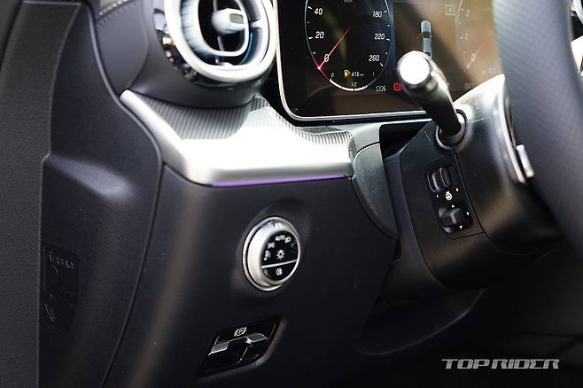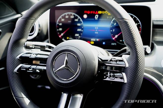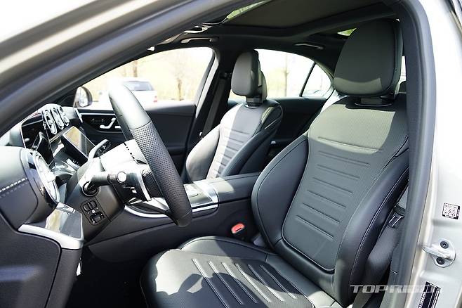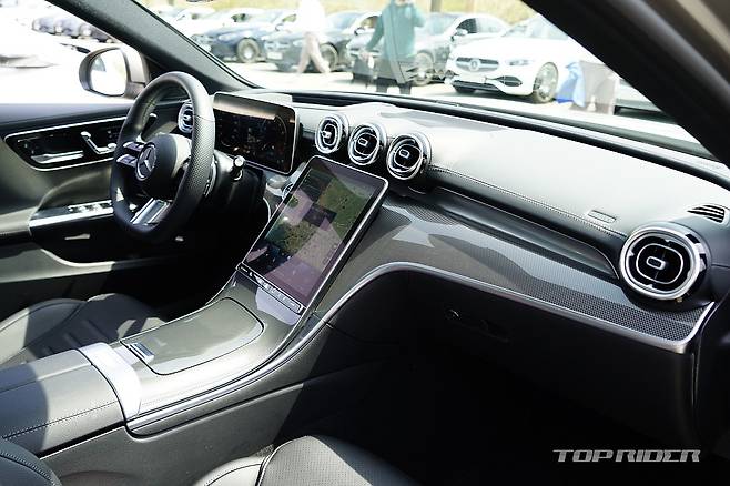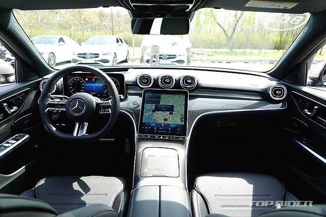 실내는 최신 모델임을 강조하는 대화면 디스플레이가 시선을 잡아끈다. C클래스의 오랜 전통인 전동식 텔레스코픽 스티어링 휠에, 시트 조절 스위치는 신형 S클래스와 같은 조작법의 고정식 버튼이다. 터치와 스와이프, 물리적 입력을 구분하는 스위치가 폭 넓게 적용됐다.