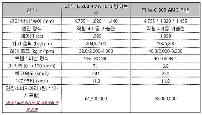 국내에 선보인 신형 C클래스 트림은 2가지로 C300 AMG 라인(6800만원), C200 4MATIC 아방가르드(6150만원)으로 구성된다. 1열 통풍, 전동 트렁크, 선루프, 최신 운전보조장치가 모두 기본으로 C300에는 전용 외장 패키지와 헤드업 디스플레이, 증강현실 내비가 더해진다.