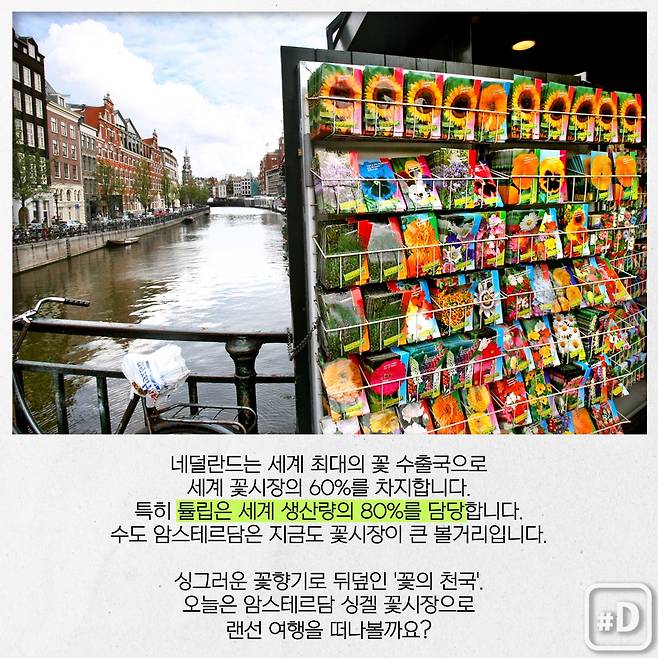 (서울=연합뉴스) 네덜란드는 세계 최대 꽃 수출국입니다. 세계 꽃시장의 60%를 차지하죠. 그중 튤립은 세계 생산량의 80%를 담당합니다. 자연히 수도 암스테르담은 지금도 꽃시장이 큰 볼거리입니다. 싱그러운 꽃향기로 뒤덮인 '꽃의 천국'. 오늘은 암스테르담 싱겔 꽃시장으로 랜선 여행을 떠나볼까요?