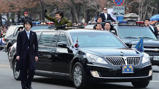 박근혜 대통령 때는 에쿠스 리무진을 훨씬 더 길게 늘린 모델인 스트레치드 리무진 모델로 만든 에쿠스를 의전차량으로 사용했어요. 취임식때 탔었던 이 차량은 특수 엔진을 장착하고 문의 두께가 6~7cm로 굉장히 두텁고 바퀴는 펑크가 나더라도 80km로 30분 주행이 가능한 성능을 가진 차량이었어요.