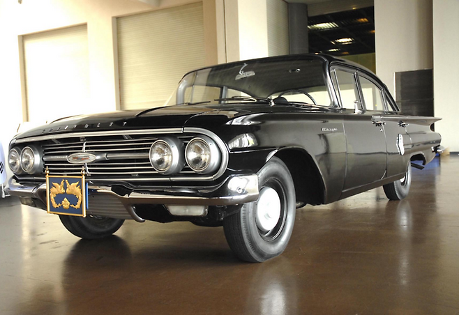 5대 대통령인 박정희 대통령이 탔던 의전차량은 쉐보레 비스케인 차량이었어요. 이 차량은 캐딜락이나 링컨에 비하면 고급브랜드의 차량은 아니지만, 당시 자동차라는 물건 자체가 귀했기 때문에 고급스러움을 느낄 수밖에 없었어요. 이 차량은 당시 미국에서 유행하던 테일핀(비행기 꼬리날개를 상징하는 디자인) 디자인이 채택되어 유니크한 모습을 가지고 있는 차량이에요. 직렬 6기통 3.9리터 엔진이 탑재되었고 최고 출력 135마력의 힘을 낼 수 있었습니다.
