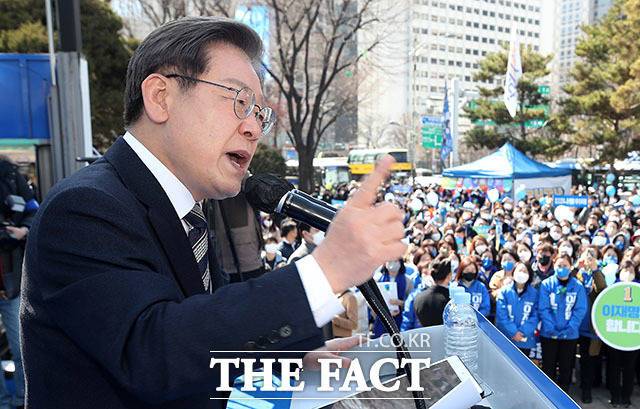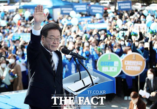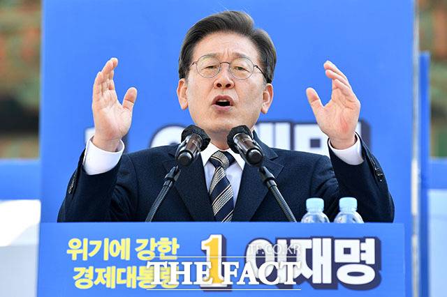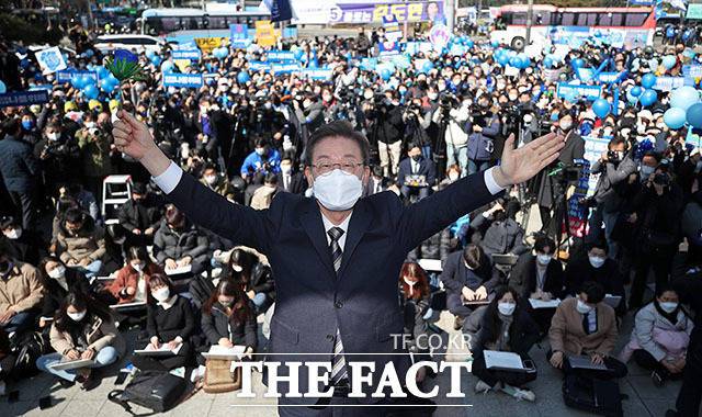 [더팩트ㅣ남윤호 기자] 이재명 더불어민주당 대선 후보가 3일 서울 종로구 보신각터에서 열린 '우리 모두를 위해, 성평등 사회로' 유세에서 '귀엽다'는 지지자들의 말에 화답하며 익살스런 포즈로 인사하고 있다.