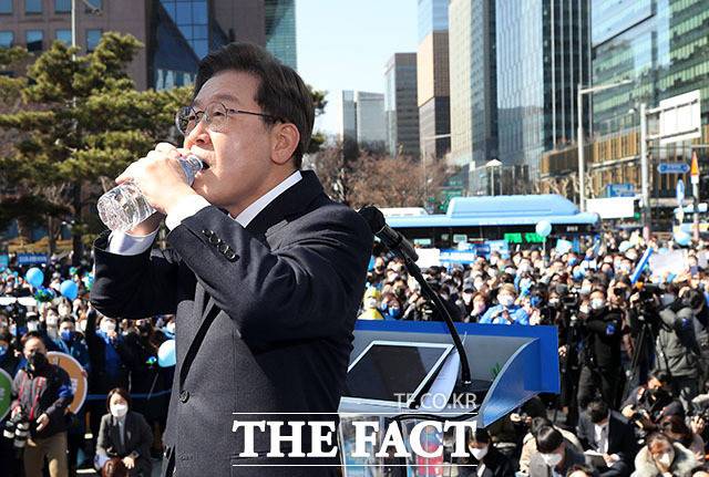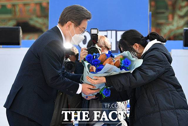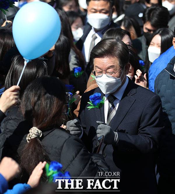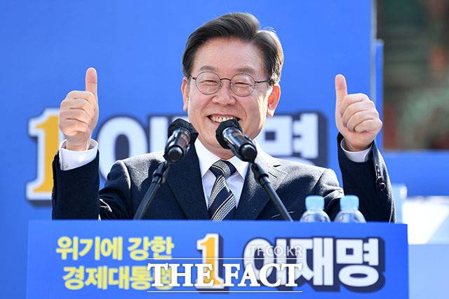 '볼에 콕' 이재명, "귀엽다"는 지지자 말에 '귀요미 포즈' [TF사진관]