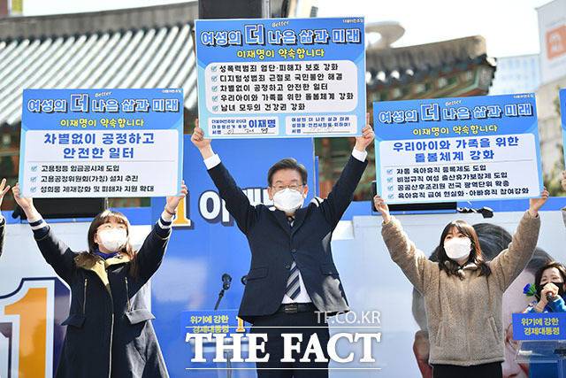 이재명 후보는 이날 유세에서 △성폭력범죄 엄단, 피해자 보호 강화 △디지털성범죄 근절로 국민불안 해결 △차별없이 공정하고 안전한 일터 △우리아이와 가족을 위한 돌봄체계 강화 △남녀 모두의 건강권 강화 등이 담긴 공약판에 서약했다.