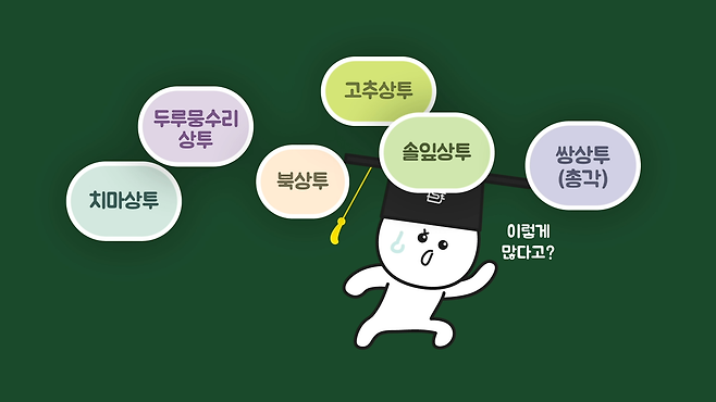 조선시대에 상투에 관해 자세히 설명한 글은 찾기 어려웠고, 일제강점기 때 설명한 글은 찾을 수 있었습니다. 글에 따르면 상투는 두루뭉수리상투, 북상투, 치마상투, 고추상투, 솔잎상투, 쌍상투(총각) 등 6가지 종류가 있다고 합니다.