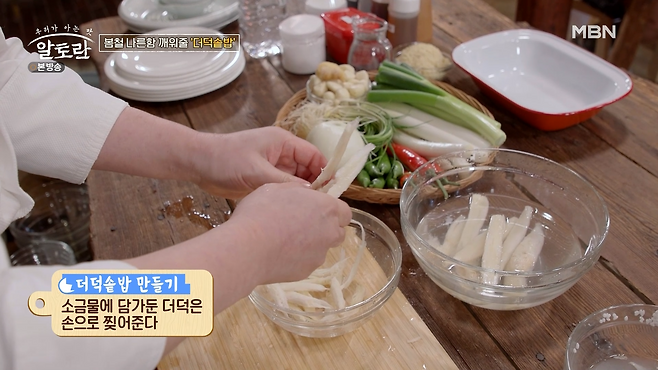 그다음, 소금물에 담가둔 더덕은 손으로 쭉 쭉 찢어주시고요