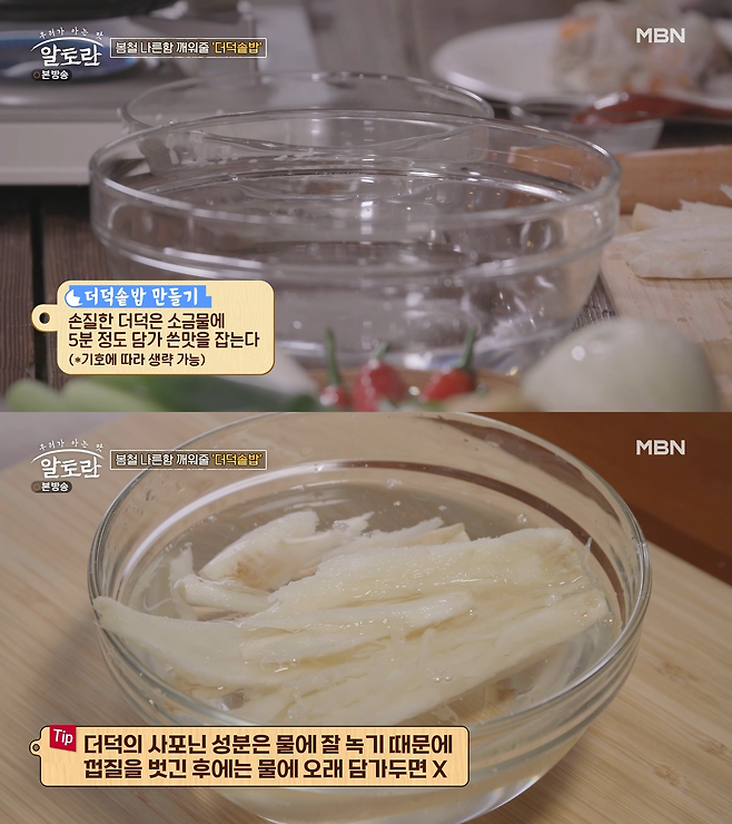 더덕의 사포닌 성분은 물에 잘 녹기 때문에 껍질을 벗긴 후에는 물에 오래 담가두면 안 됩니다! 그래서 5분 이상 담그는 것은 정말 비추천 드려요!