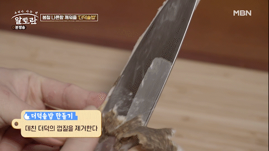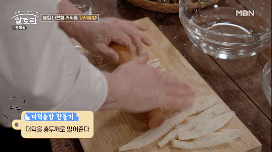 더덕을 두드리면, 향과 식감이 떨어지기 때문에 더덕을 밀어주세요!