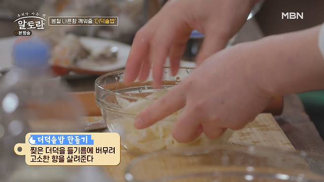 이 찢은 더덕을 들기름에 버무려 고소한 향을 살려줍니다!