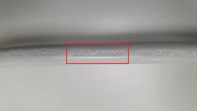 전선 두께는 전선에 적혀있습니다. 전선을 잘 살펴보면 3 x 1.5㎟(또는 SQMM)이라고 적혀 있는데, 뒤의 ㎟앞에 있는 숫자가 전선의 두께입니다.