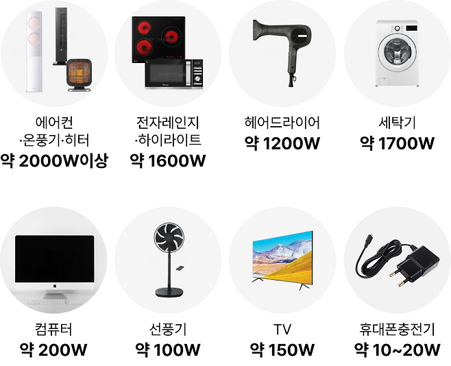 예를 들어, 에어컨/온풍기/전기난로/전자레인지/세탁기/헤어드라이어/다리미/하이라이터와 같은 제품은 냉기나 열기를 사용하기 때문에 소비 전력이 높은 편입니다. 반대로, 선풍기나 TV, 컴퓨터, 핸드폰 충전기처럼 온도 조절과 관련 없는 제품은 소비 전력이 낮은 편입니다.