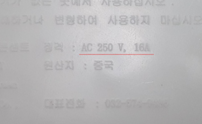 예를 들어, 16A에 250V라 적혀 있다면 16 x 250 = 4000W가 사용 가능한 정격 용량이라고 보시면 됩니다. 최대 사용 가능한 용량의 80%만 사용하시는 것이 안전합니다.