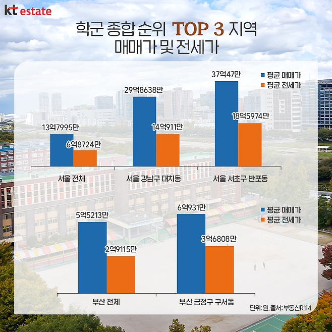 이를 다시 지역별로 구분해보니 서울 6곳, 부산 2곳, 경기 1곳, 대전 1곳으로 분류됐는데요. 어느 곳보다 교육열이 높은 강남 8학군 지역인 강남구 대치동과 서초구 반포동은 전통 명문 학군답게 학군 종합 순위 1, 2위를 차지했고, 부산의 대표 학군지 중 하나인 부산 금정구 구서동은 3위에 오르며 서울 외 지역에서 가장 높은 순위를 기록했습니다.