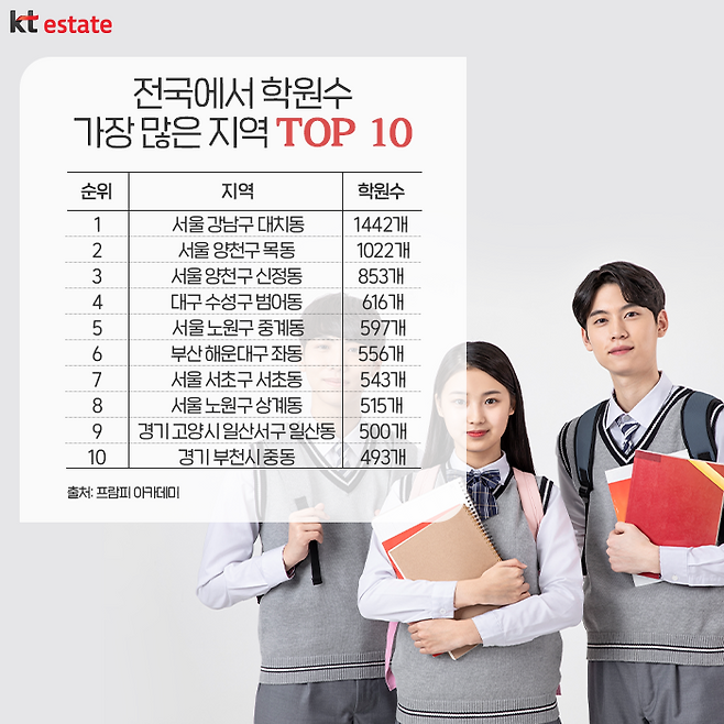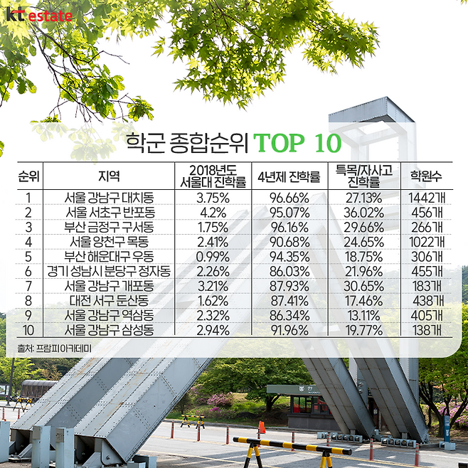 KT에스테이트가 학원 정보 서비스업체 ‘프람피 아카데미’의 학군 종합 순위(2020년 기준)를 찾아본 결과, 상위 10곳은 △서울 강남구 대치동 △서울 서초구 반포동 △부산 금정구 구서동 △서울 양천구 목동 △부산 해운대구 우동 △경기 성남시 분당구 정자동 △서울 강남구 개포동 △대전 서구 둔산동 △서울 강남구 역삼동 △서울 강남구 삼성동 순으로 나타났습니다. 프람피 아카데미의 학군 순위는 서울대 진학률 순위, 4년제 대학교 진학률 순위, 특목/자사고 진학률 순위, 학원수 순위 등을 종합해 평가하는 것으로 알려져 있습니다.