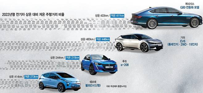 쉐보레가 올해 출고를 앞둔 볼트 EUV와 2022년형 볼트 EV는 상온 대비 저온 주행거리 비율이 조사 대상 가운데 가장 낮았다. 두 차종은 상온에서 모두 400㎞ 이상을 달릴 수 있으나 저온에서는 볼트 EUV 279㎞(69.2%), 신형 볼트 273㎞(65.9%)에 그쳤다.