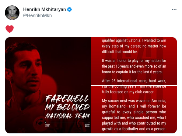 미키타리안은 3일 오후(한국시각) 자신의 공식 SNS 채널을 통해 아르메니아 대표팀 유니폼을 벗는다고 알렸다.