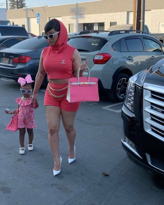 모녀 커플템도 유명하죠. 이 가방은 아빠인 오프셋이 컬쳐의 두 돌 선물로 준 1만 달러 상당의 에르메스 버킨백이었습니다.
