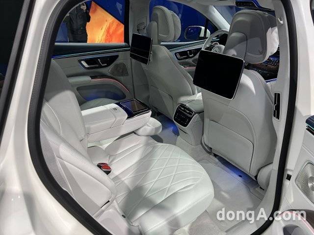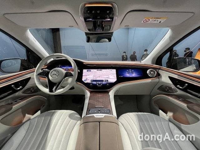 벤츠는 과거 프랑크푸르트모터쇼 장소로 사용된 전시관을 빌려 출입구와 가까운 곳 2군데에 신차를 전시했다. 각각 커다란 암막커튼을 쳐 내부 조명과 인테리어를 꾸미고 신차를 전시했다. 빛이 새어나오는 암막커튼 입구로 들어가 EQS SUV 실물을 확인했다. 전시 모델은 AMG 라인과 일반 버전 2종이다. 신차 전시 공간 앞에는 벤츠가 자체 개발한 전기차 아키텍처를 전시했다. EQS SUV를 비롯해 EQS 세단과 EQE 세단, EQE SUV가 모두 해당 플랫폼을 공유한다고 표시해 놨다.