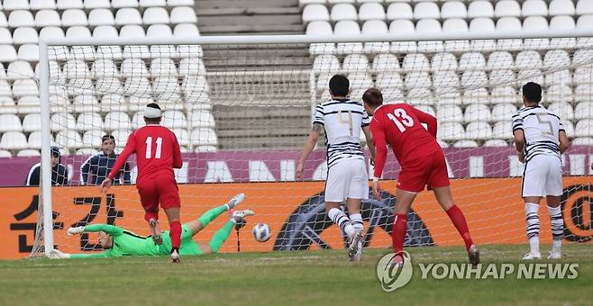 (시돈=연합뉴스) 김인철 기자 = 27일(현지시간) 레바논 시돈의 시립경기장에서 열린 2022 카타르 월드컵 아시아 최종예선 조별리그 A조 7차전 대한민국과 레바논의 경기. 레바논 펠릭스 미셸의 중거리 슛이 한국 골대를 맞아 빗나가고 있다. 2022.1.27