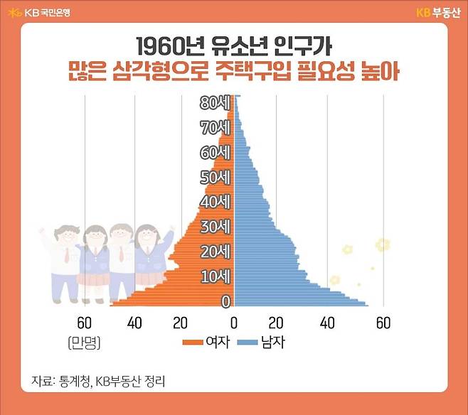 1960년의 인구피라미드는 뚜렷한 삼각형 모습이었습니다. 유소년 층의 비중이 크고, 노년층 비중이 적은 다산다사형(多産多死型) 인구구조로 개발도상국의 대표적 형태죠. 유소년 비중이 높아 주택구입 필요성이 높지만, 경제력이 뒷받침되는 40~50대 인구가 적고, 주택공급량도 부족해 실제 주택구입으로 연결되는 경우가 흔치 않았던 시절입니다.