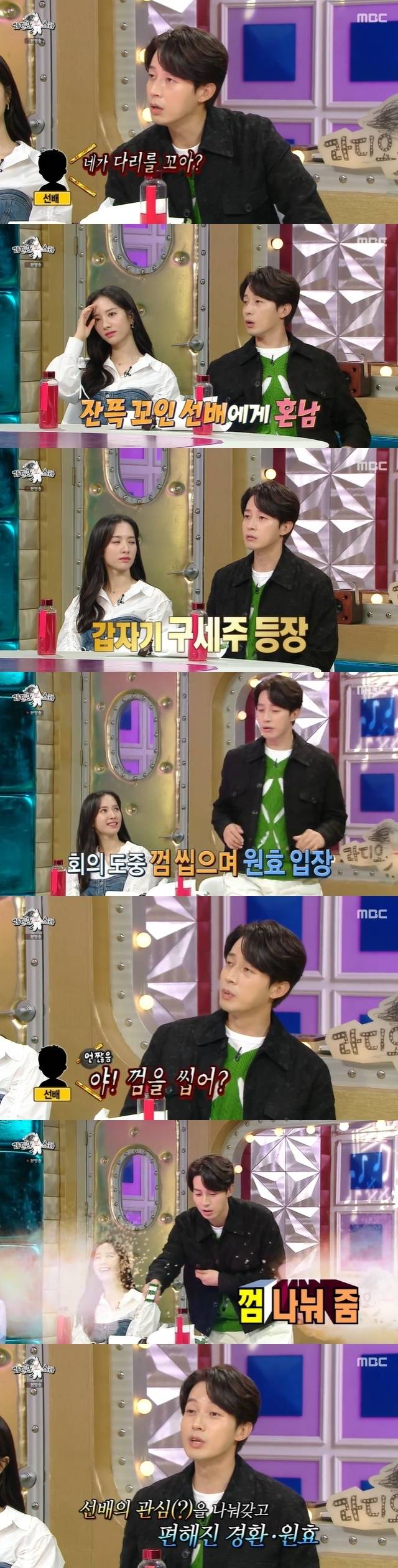 허경환은 "알잖나. 초반에 찍히면 답도 없는 거. 내가 개그계 생활을 할 수 있을까 고민 하는데 구세주가 나타났다. 김원효가 개념 없기로 유명한데 애가 착하다. 어느날 김원효가 회의를 하고 있는데 껌을 씹고 들어온 거다. 선배가 보더니 '야, 껌을 씹어? 껌?' 이랬다. 우리같으면 '죄송하다'며 껌을 뱉을 텐데 갑자기 김원효가 껌을 꺼내더니 선배들에게 나눠줬다. 우리는 '죽었다'고 생각했다"고 털어놨다.