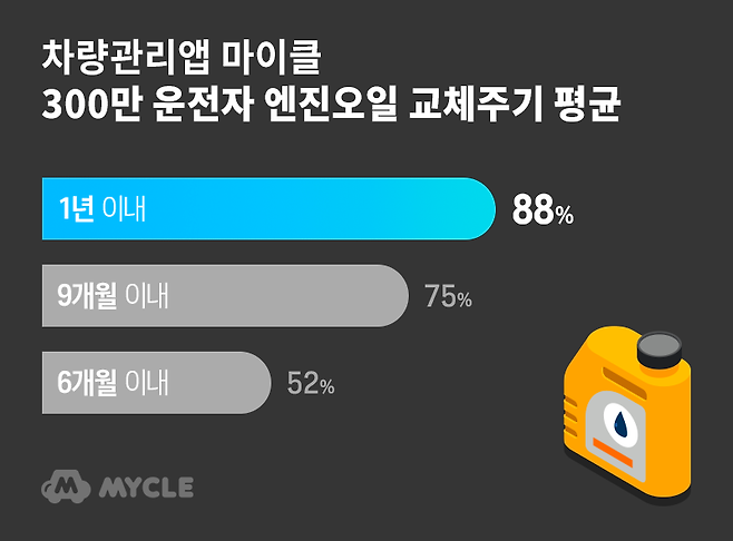 가장 많은 운전자의 데이터가 쌓여있는 차량관리앱 마이클의 300만 운전자를 조사해 본 결과, 88%의 대다수 운전자가 적어도 1년에 한 번은 엔진오일을 교환하고 있다고 답했습니다.