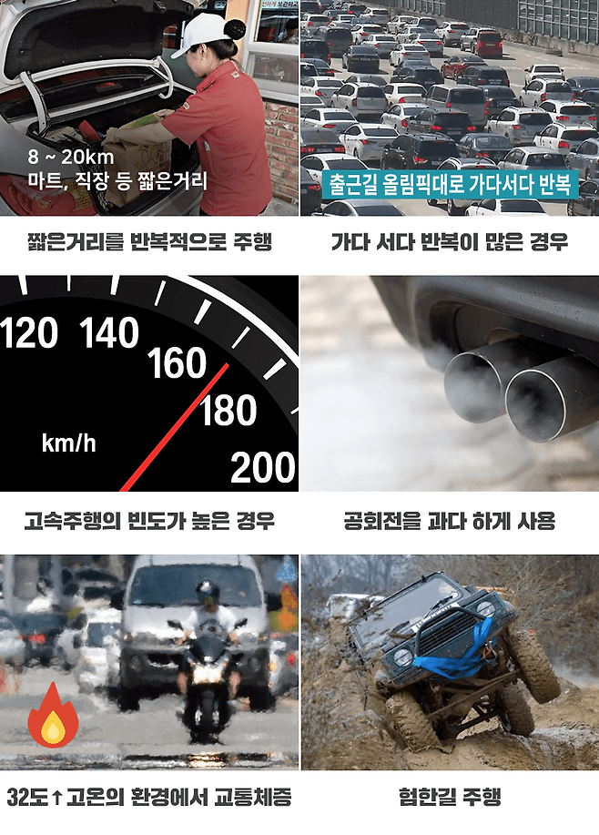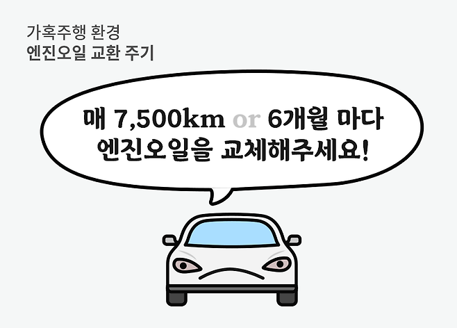 주행거리가 많거나 급출발, 급정거가 많은 시내주행 비율이 높은 가혹주행 상황에서는 제조사에서 엔진오일 교체주기를 더 짧게 가져가라고 권장합니다.