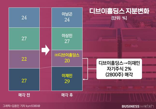 디브이홀딩스가 소유 중인 자기주식 22% 중 2%를 매입한 데 따른 것이다. 이에 따라 첫째동생 이상민(33)씨와 공동최대주주로서 각각 27%를 갖고 있던 균형은 깨졌다. 이어 둘째동생 이남곤(30)씨 24%, 디브이홀딩스 자기주식 22%로 재편됐다.