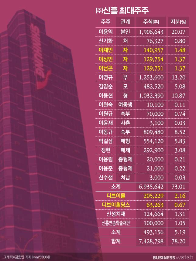 신흥이 디브이홀딩스를 지렛대로 차츰 3대 가업승계에 공을 들이는 와중에도 이 대표의 맏아들이 향후 후계구도에서 점점 우위를 점하고 있다는 뜻이 된다. 우선 디브이홀딩스가 모회사이자 주력사인 ㈜신흥 지분을 적잖이 갖고 있어서다.
